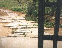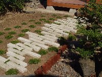 Moss" plants are cut into thirds and tucked between the pavers. In a year, the moss will tightly surround and fill in the path.