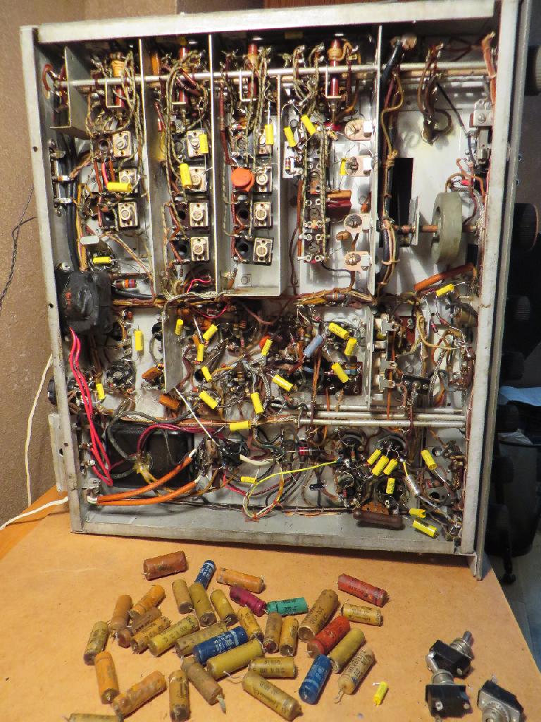 I removed and restored the case with a hammered finish, de-greased the chassis and soldered in new replacement capacitors replacing the old paper capacitors. It worked remarkably well, but unfortunately Short Wave radio has fallen victim to the internet age. Internet radio has replaced most short wave stations leaving little to listen to today. Still there are some stations still out there broadcasting. The scary part was connecting up a short wave antenna on the roof. That's a two-story house and a long way down if one isn't careful.