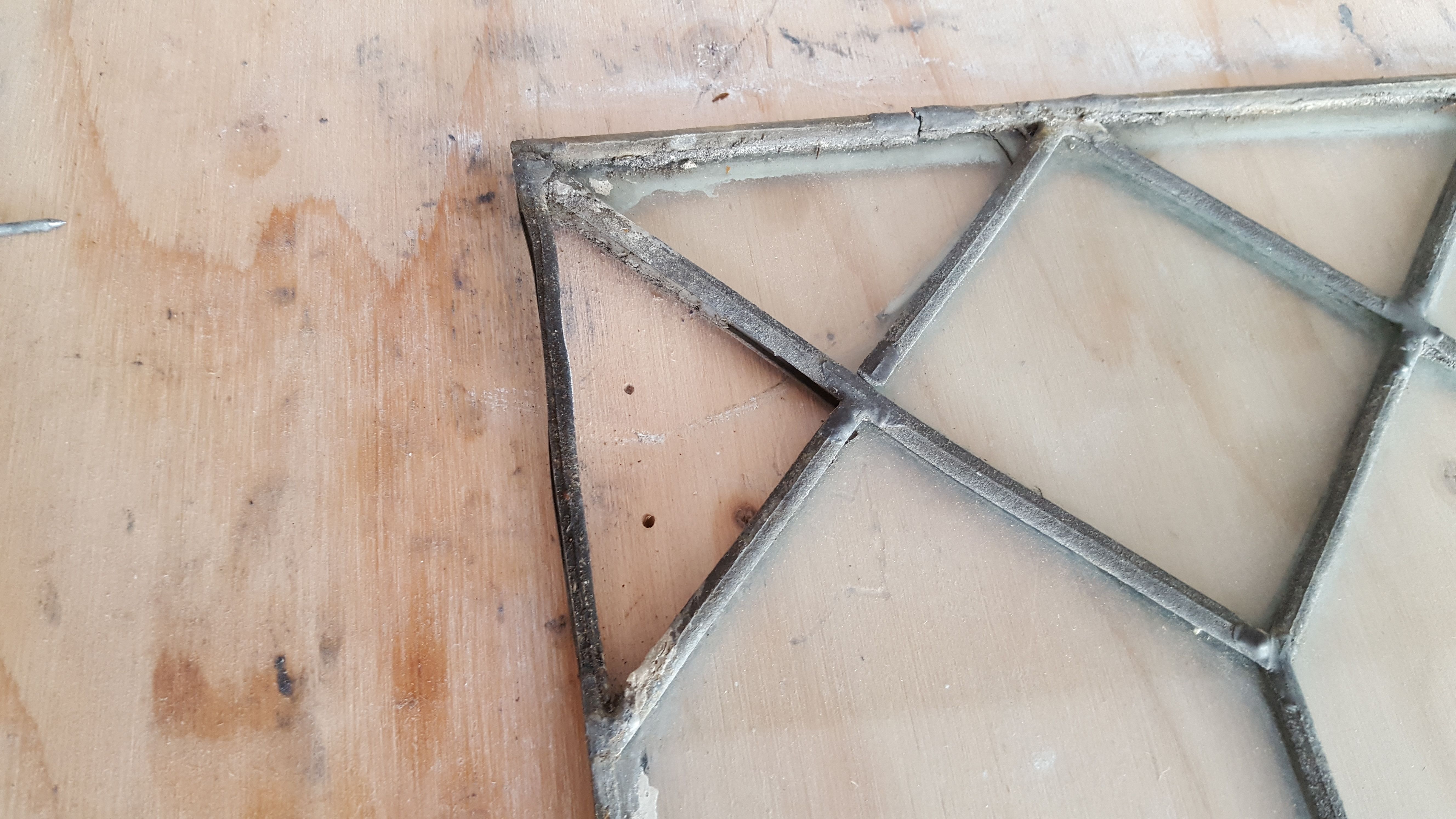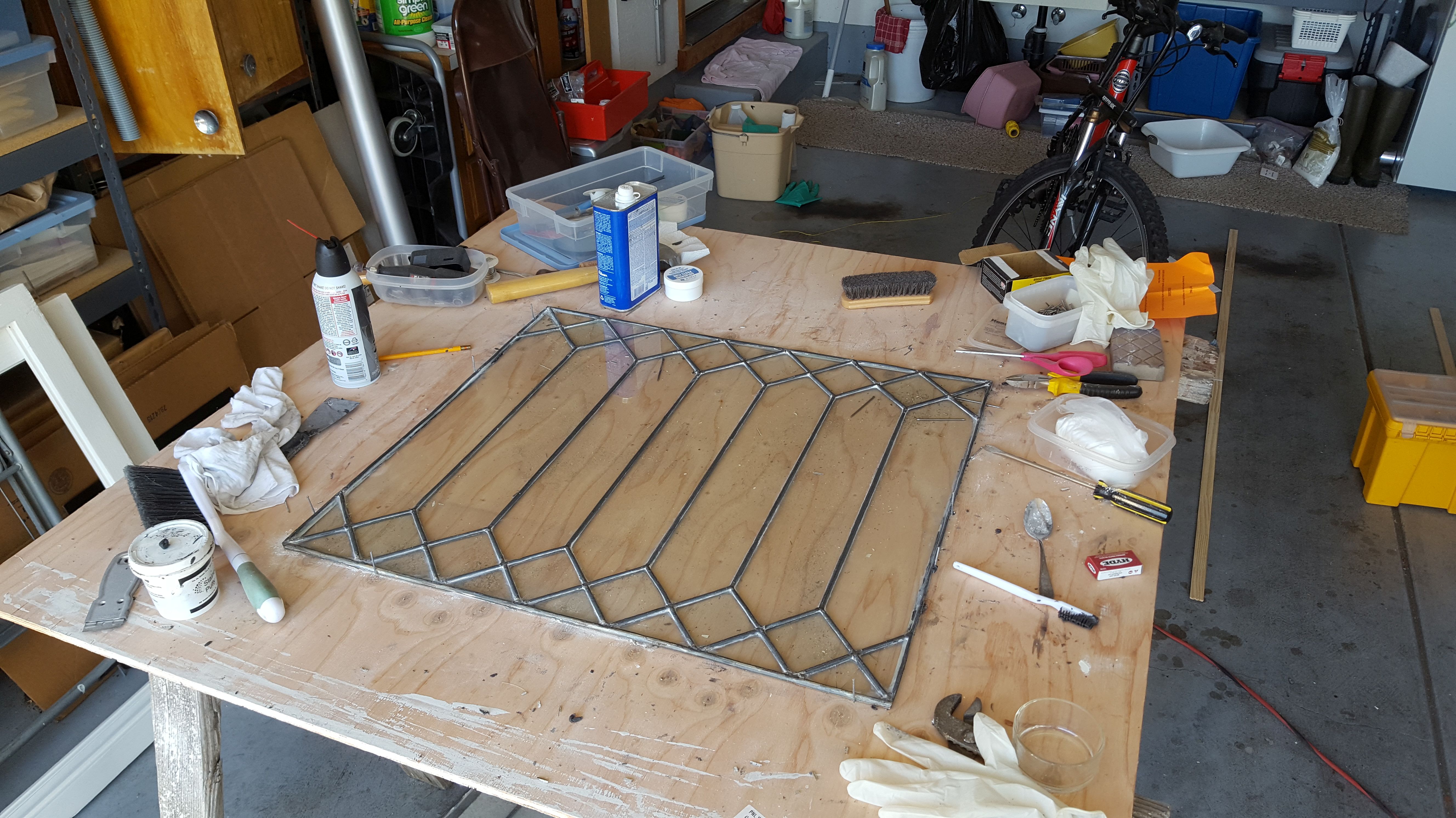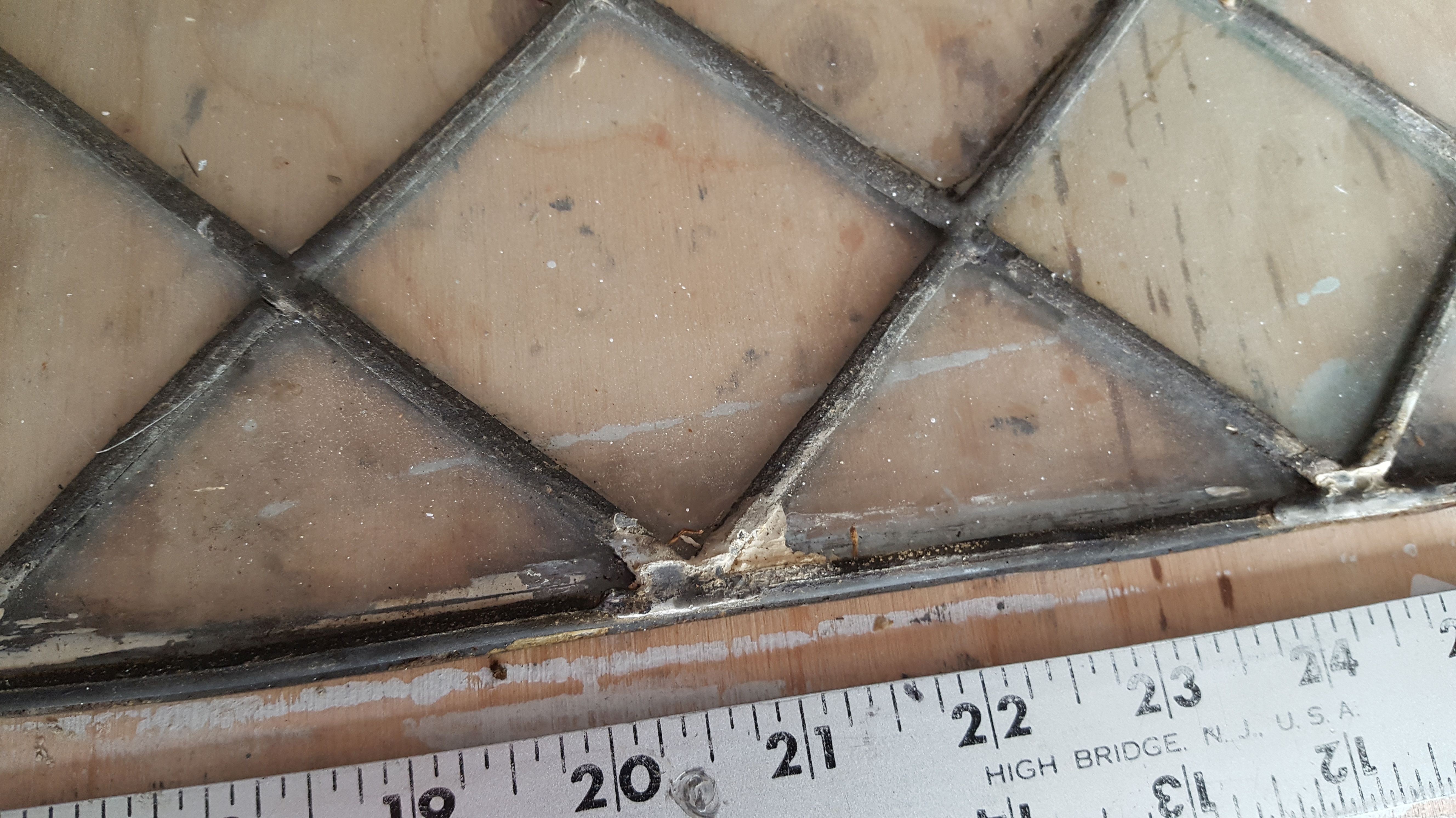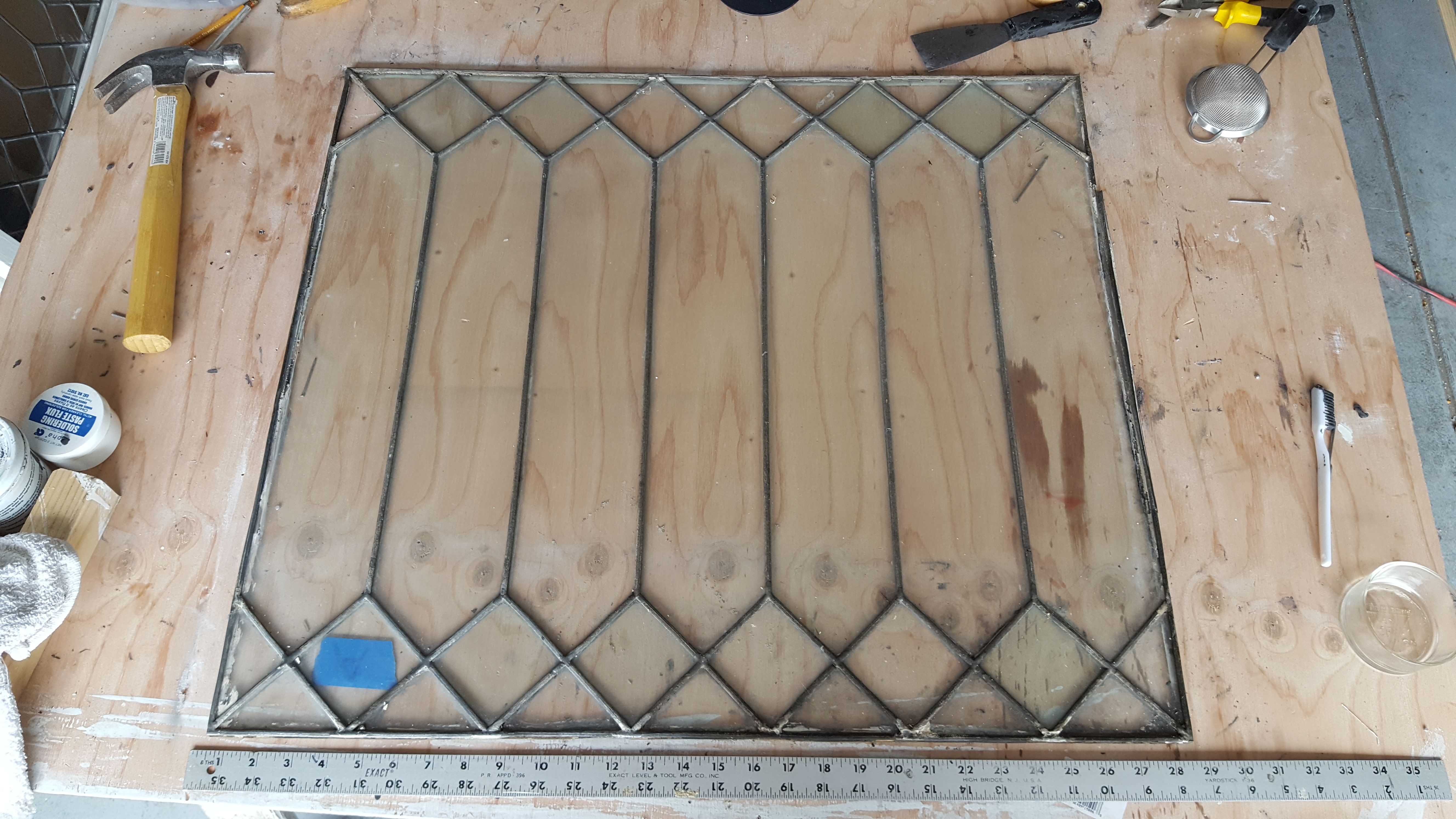 The glass was removed from the frames, the frames stripped and sanded to the extent possible. One of the leaded panes was repairable but the other had to be completely reassembled. I had never worked with leaded glass before. New lead strip was purchased and some of the pieces of glass had to be recut. I had some previous experience soldering electronics but soldering larger elements took a bit of practice. The restored leaded panels were replaced in the restored frames. The restored windows now grace either side of my daughter's fireplace.