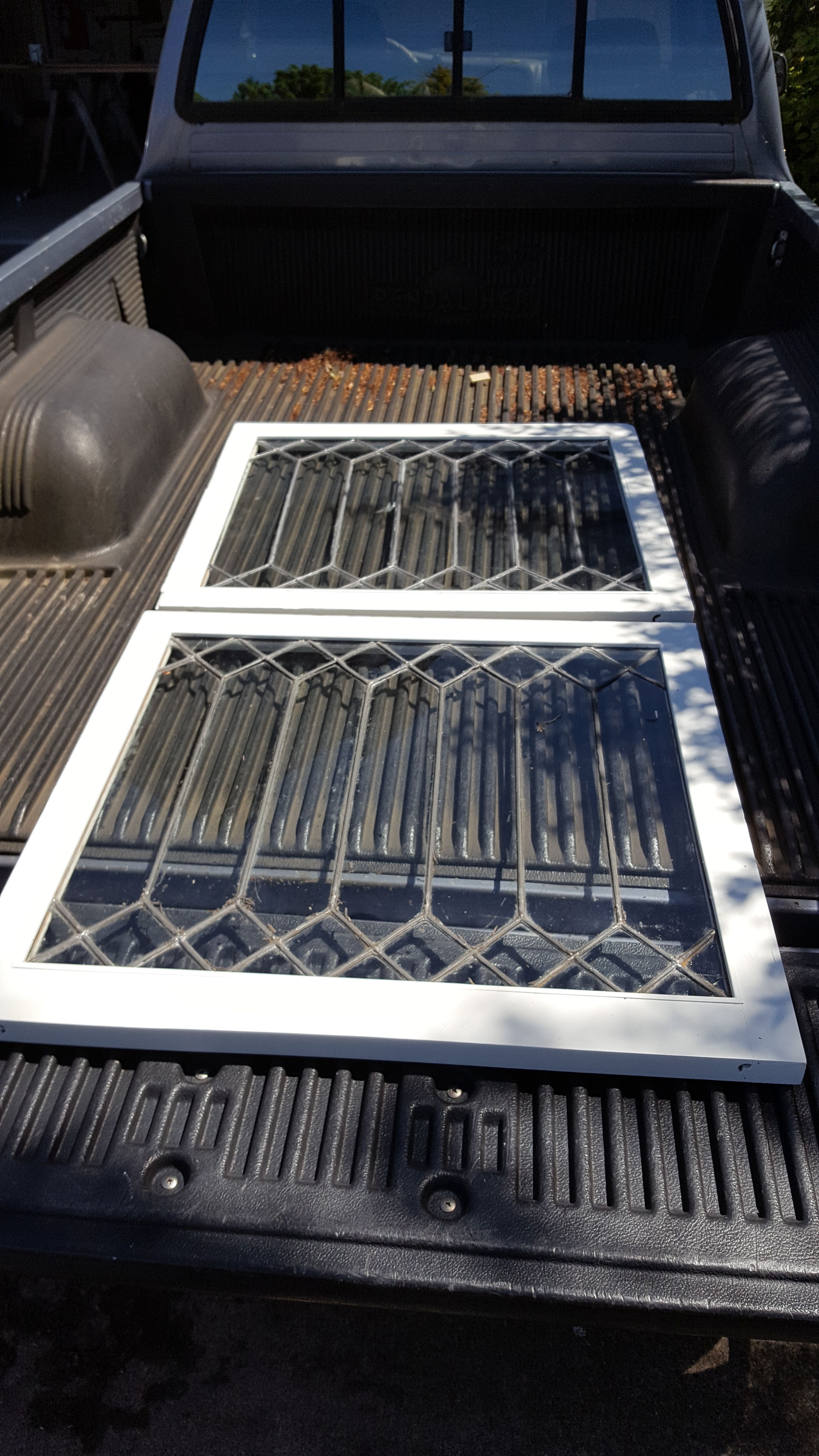 Two leaded glass windows recovered from my daughter's early 1900s remodeled house. The windows were covered by interior